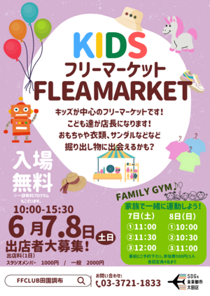 こんにちは!FFCLUB田園調布では6/7.8にスタジオ内にてキッズフリーマーケットを開催します。 是非スタジオに遊びにいらして下さい♪